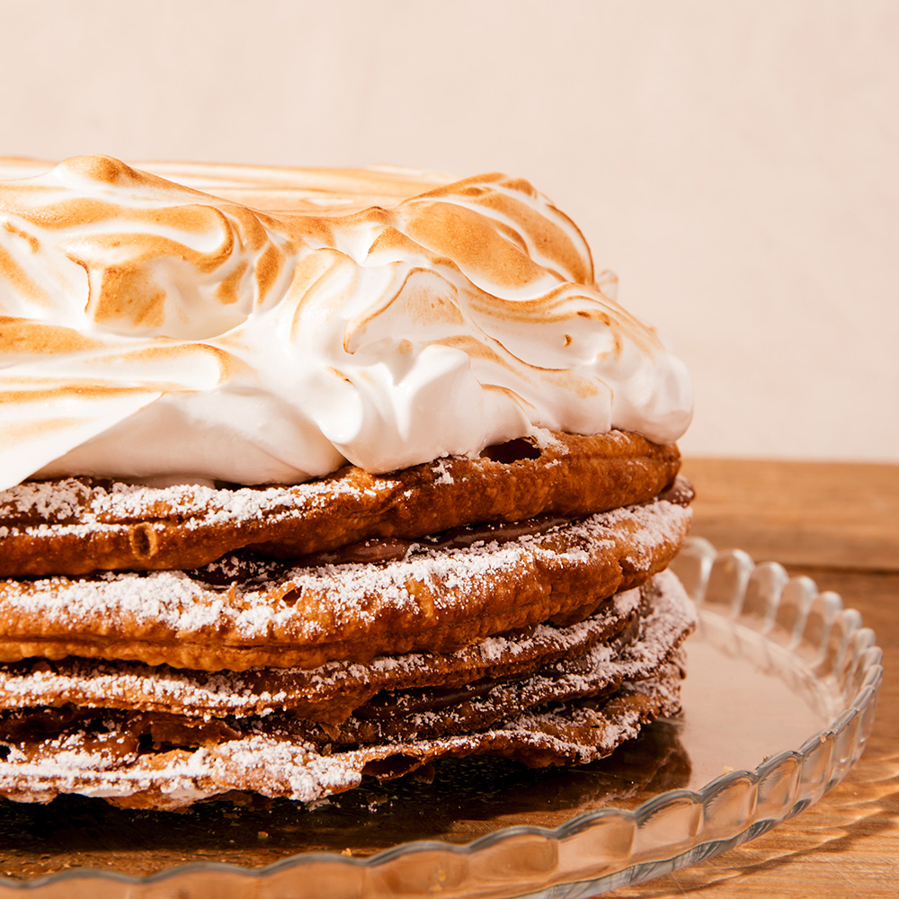 Un clásico en nuestro obrador, finas capas de hojaldre intercaladas con dulce de leche casero  coronadas con merengue italiano.